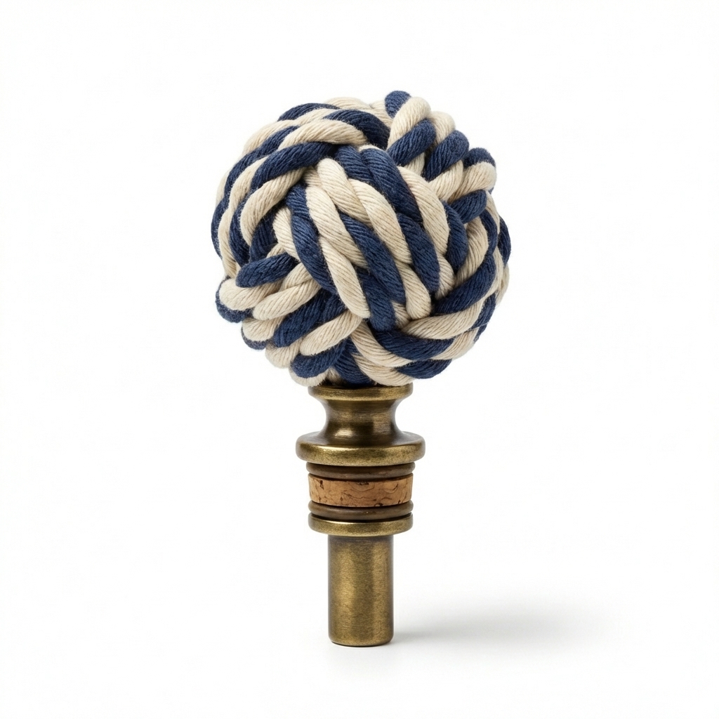 Hand-knotted monkey fist in marine cotton over brass core. Food-safe silicone stopper. The bar accessory that looks like it belongs.