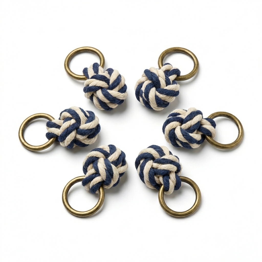 Six hand-tied knots, each a different configuration — reef, bowline, cleat, clove hitch, figure eight, and monkey fist — looped on a small brass ring that fits any standard wine glass stem.